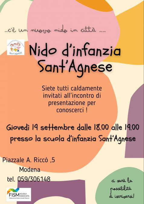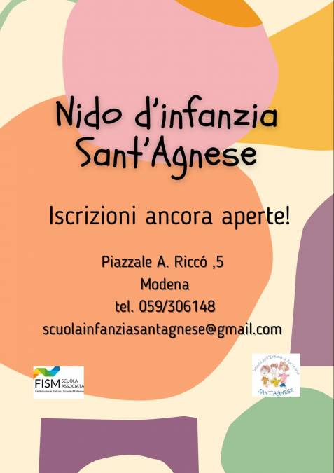Il nido d’infanzia Sant'Agnese è un servizio educativo a gestione privata, accreditato con il Comune di Modena, che offre un servizio pubblico ed appartiene al sistema Educativo Integrato promosso dalla Regione Emilia Romagna e aderisce alla FISM di Modena. Accoglie in un'unica sezione bambini di età compresa fra i 9 e i 36 mesi, all’interno della già esistente scuola dell’Infanzia paritaria Sant'Agnese, costituendo così un Polo per l’Infanzia 06. Le educatrici sono professionalmente preparate e qualificate; l’offerta educativa-pedagogica nasce da una progettualità intenzionale, contestualizzata, personalizzata che parte dall’osservazione dei bambini, nel rispetto dei loro bisogni di crescita, interessi e tempi. Gli spazi sono progettati per conciliare il bisogno di autonomia, rassicurazione e sicurezza dei bambini con la necessità di esplorare e scoprire il mondo.